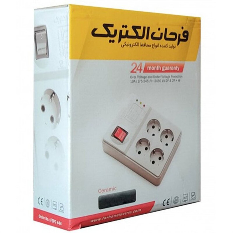 یکی از محصولات شرکت فرحان الکتریک محافظ برق 4 پریز ارت دار با مغزی سرامیکی میباشد. این وسیله لوازم صوتی و تصویری و کامپیوتر را در برابر قطع و وصل و نوسانات شدید برق محافظت مینماید. بعد از وصل کردن محافظ به برق شهر چراغ زرد به علامت زمان تاخیر روشن و پس از پایان زمان تاخیر که حدود 1 دقیقه است، چراغ زرد خاموش و چراغ سبز به علامت برق دار شدن پریزها روشن میشود. در صورت افت ولتاژ یا افزایش ولتاژ از حد مجاز پریزها بطور اتوماتیک بدون برق شده و چراغ قرمز روشن می شود. پس از رسیدن ولتاژ به حد مجاز، چراغ قرمز خاموش و چراغ زرد روشن شده و پس از گذشت زمان تاخیر چراغ سبز همزمان با برق دار شدن پریزها روشن خواهد شد. طول کابل محافظ لوازم صوتی و تصویری و کامپیوتر فرحان الکتریک 1.8 متر میباشد. مدت زمان تاخیر 1 دقیقه و فرکانس ورودی آن نیز 50 هرتز میباشد.